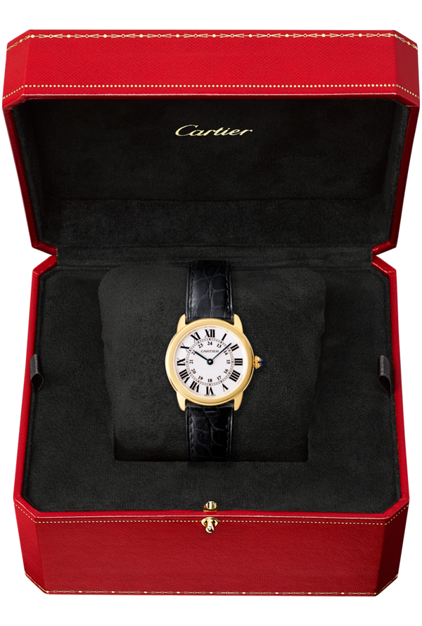 Roman numerals, blue apple-shaped hands, winding mechanism crowned with a sapphire and rail-track minute circle: the Ronde Louis Cartier watch is a classic timepiece by Cartier.